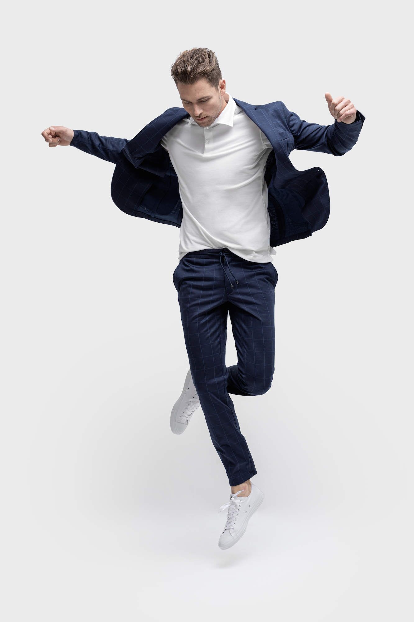 Het model AP25 staat afgebeeld in een twee delen sportieve uitvoering. In een donker blauwe kleur met ruit motief. Maar dit is slechts een voorbeeld uit de vele mogelijkheden. Binnen ons maatwerk systeem zijn er binnen deze serie nog vele kleur en dessin varianten in dit type stof.