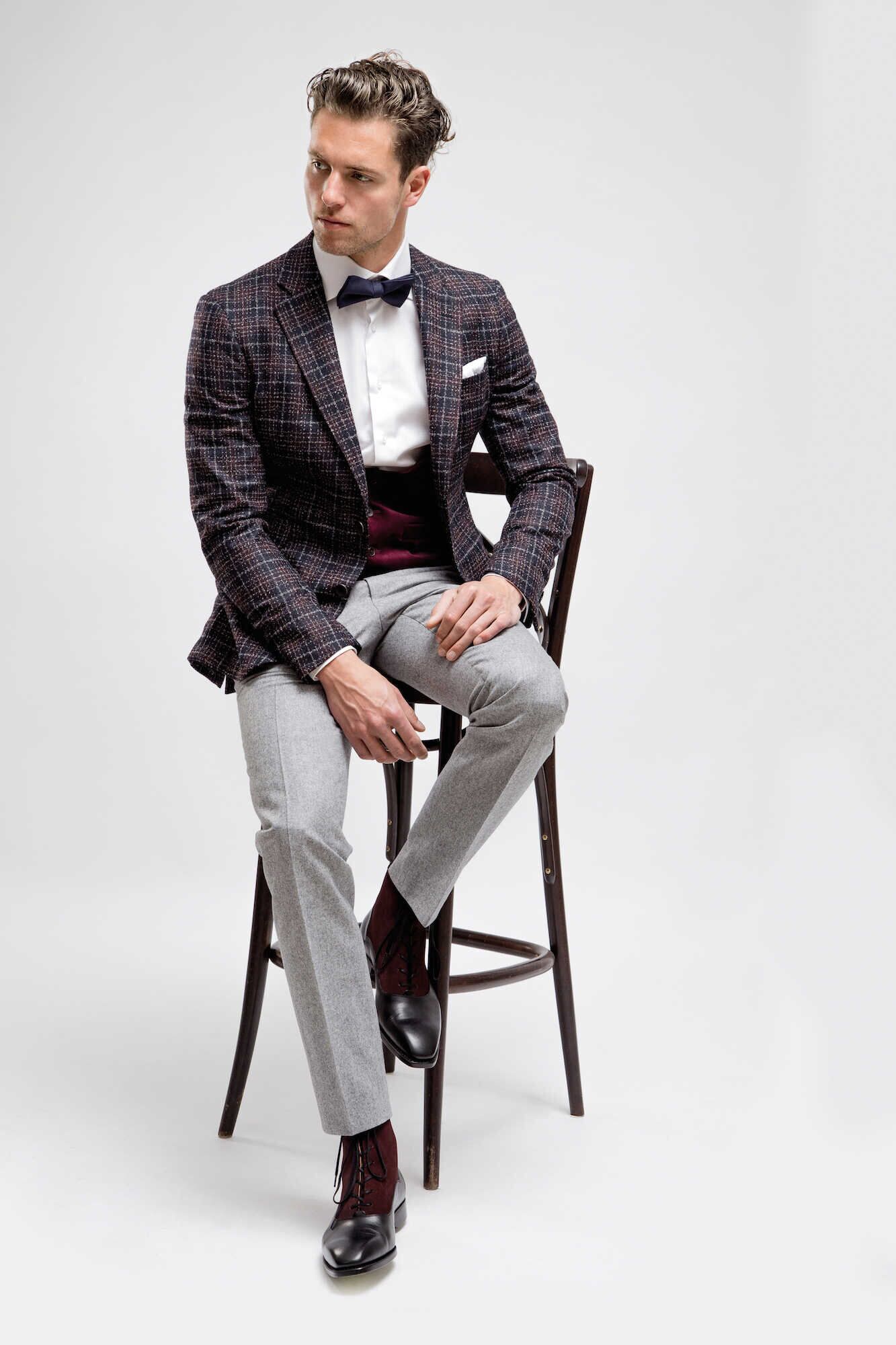 Model AP01 staat afgebeeld in een twee delen smoking look in een blend rood met ruiten uitvoering. Maar dit is slechts een voorbeeld uit de vele mogelijkheden. Binnen ons maatwerk systeem zijn er binnen deze serie nog vele kleur en dessin varianten in dit type stof.