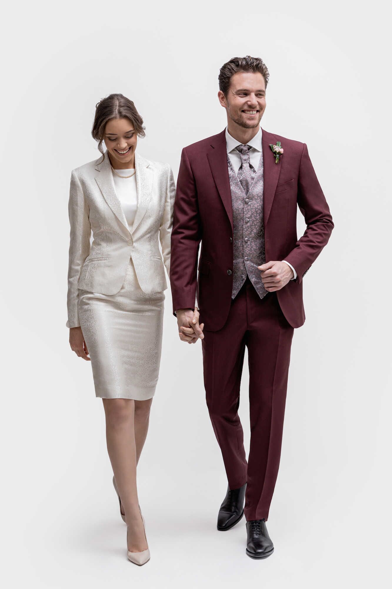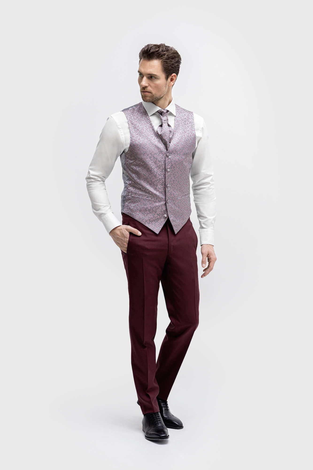 Het model AP07 staat afgebeeld in drie delen licht bordeaux rood met een effen fijne wol structuur. Het gilet is afwijkend en in veel ceremoniële dessins en kleuren verkrijgbaar. Maar dit is slechts een voorbeeld uit de vele mogelijkheden. Binnen ons maatwerk systeem zijn er binnen deze serie nog vele kleur en dessin varianten in dit type stof.