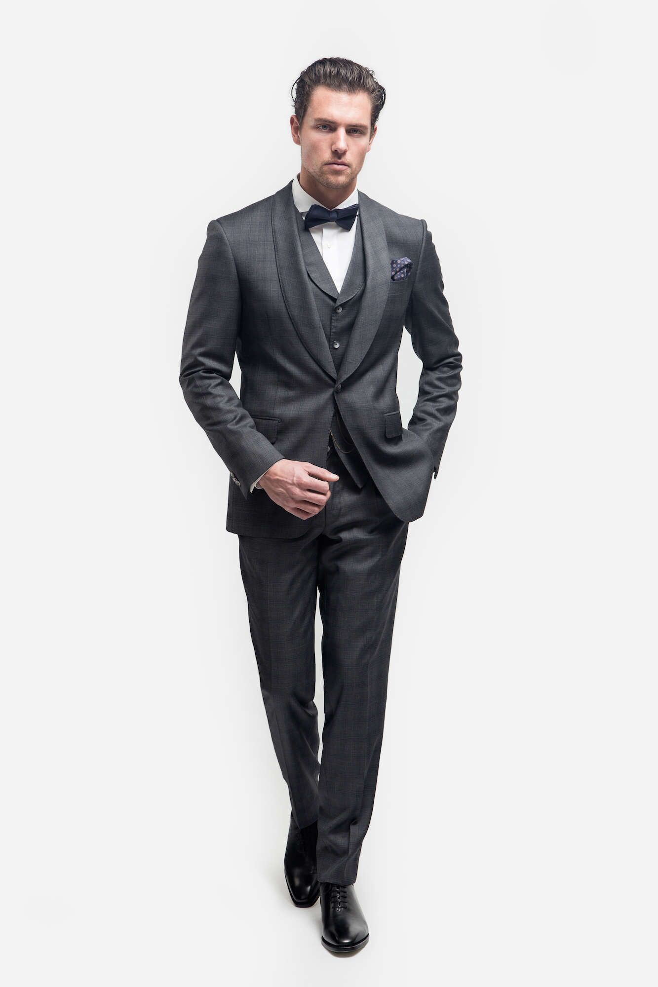 Het model AP42 staat afgebeeld in drie delen antraciet grijs. In deze fijn wollen stof is een ruit motief ingeweven. Maar dit is slechts een voorbeeld uit de vele mogelijkheden. Binnen ons maatwerk systeem zijn er binnen deze serie nog vele kleur en dessin varianten in dit type stof.