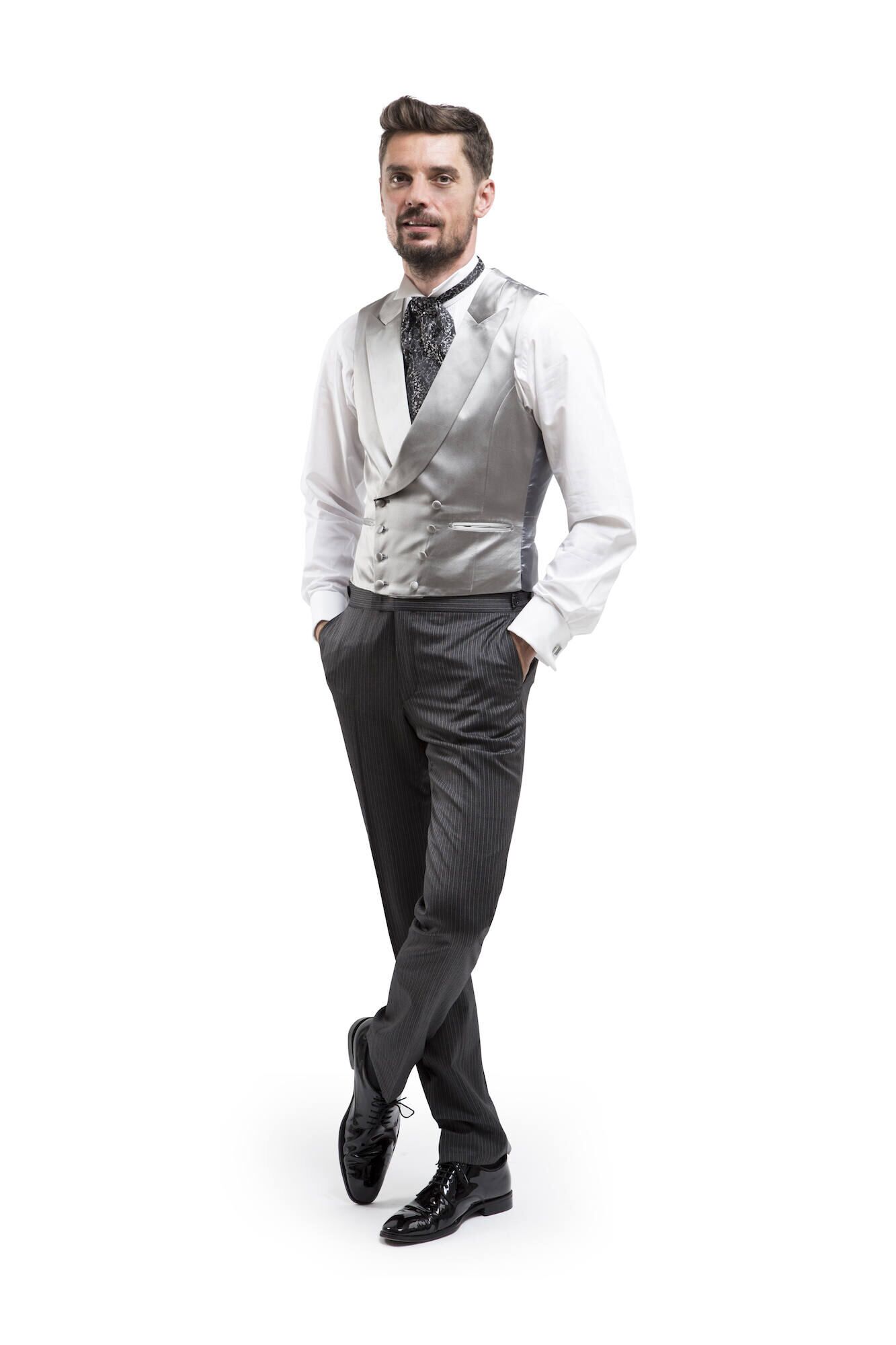 Model AP52 staat afgebeeld in een grijs met krijtstreep pantalon en een zijden zilver kleur gilet. Maar dit is slechts een voorbeeld uit de vele mogelijkheden. Binnen ons maatwerk systeem zijn er binnen deze serie nog vele kleur en dessin varianten in dit type stof.