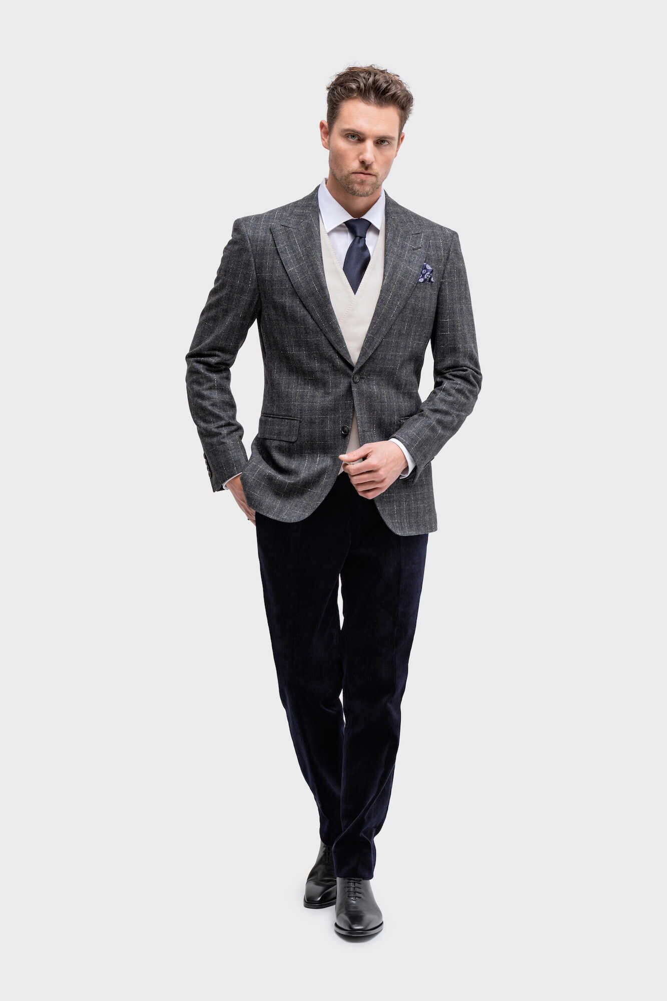 Het model AP59 staat afgebeeld in drie losse van elkaar afwijkende onderdelen. Waarvan het grijze model met lichte ruit zowel in de combinatie als los casual te combineren is. Maar dit is slechts een voorbeeld uit de vele mogelijkheden. Binnen ons maatwerk systeem zijn er binnen deze serie nog vele kleur en dessin varianten in dit type stof.