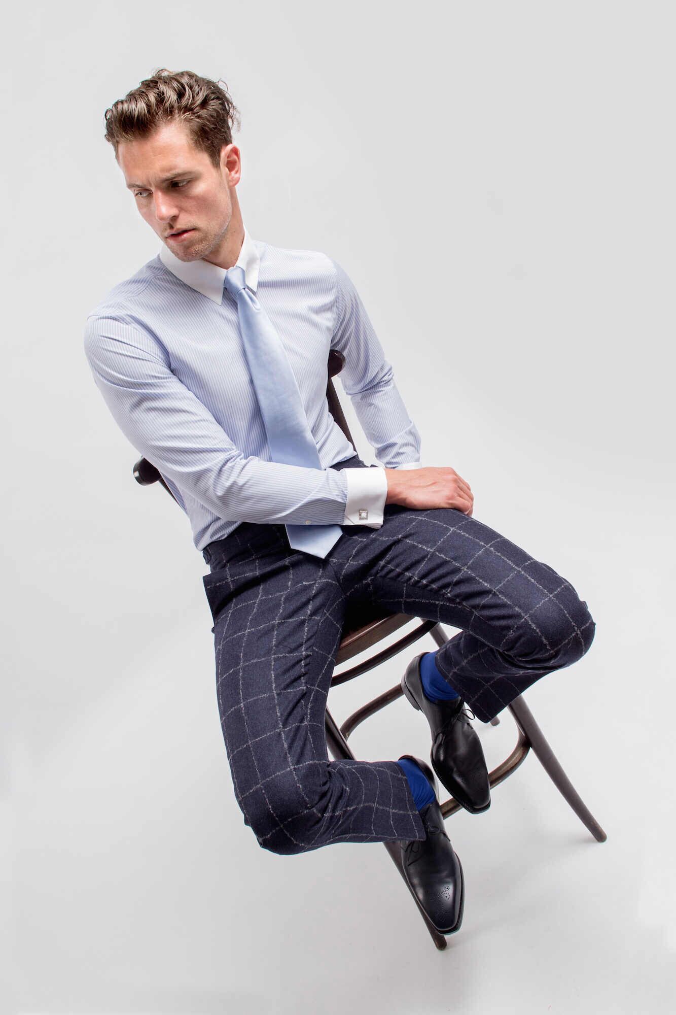 Het model AP61 staat afgebeeld in de kleur blauw met een grof ruitmotief in een zwaar wollen uitvoering. Maar dit is slechts een voorbeeld uit de vele mogelijkheden. Binnen ons maatwerk systeem zijn er binnen deze serie nog vele kleur en dessin varianten in dit type stof.