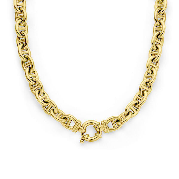 Dit fantasie opengewerkt Marine schakel collier met referentie nummer GGCO009 is in 14 karaat geelgoud uitgevoerd. Een stijlvol opengewerkt collier met een maritiem vormgegeven schakel met een doorsnede van 10 mm. Vervaardigd uit ronde buis in een lengte van 45 cm. die stijlvol rond de hals valt.