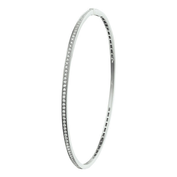 Deze rond lopende slavenarmband GGZSA053 in 14 karaat witgoud is rondom uitgevoerd met natuurlijke briljant geslepen diamant. Deze zijn in een rij zetting verdiept geplaatst voor dagelijks draagcomfort. Deze elegante vormgegeven band is uit soliede plaat dikte hol uitgevoerd in 2 millimeter breedte en is voorzien van een scharnier en een verzonken bak sluiting.