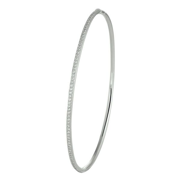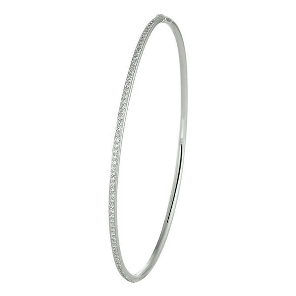 Deze rond lopende slavenarmband GGZSA054 in 14 karaat witgoud is rondom uitgevoerd met totaal 0,50 ct. aan natuurlijke briljant geslepen diamant. Deze zijn in een rij zetting verdiept geplaatst voor dagelijks draagcomfort. Deze elegante vormgegeven band is uit soliede plaat dikte hol uitgevoerd in 2 millimeter breedte en is voorzien van een scharnier en een verzonken bak sluiting.