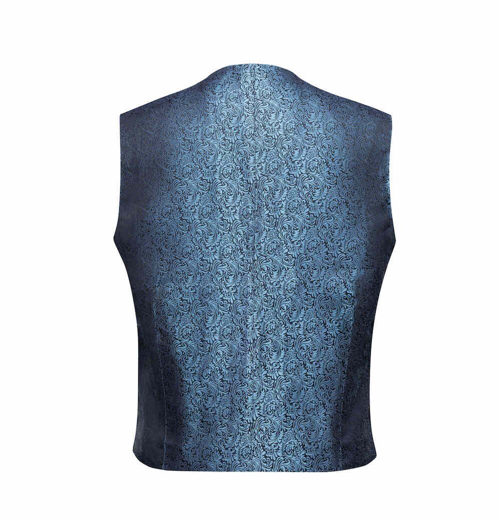 Dit GL0005 blauw trouw gilet voor heren – mannen is bewerkt met een ceremonieel patroon voor een feestelijke uitstraling. Speciaal om in te trouwen en voor de feestdagen. Uitgevoerd met een V-hals, twee zakken en vijf knopen die voorzien zijn van dezelfde stof. De rug partij is van dezelfde stof voorzien, zodat je deze altijd met je bestaande pak kunt combineren.