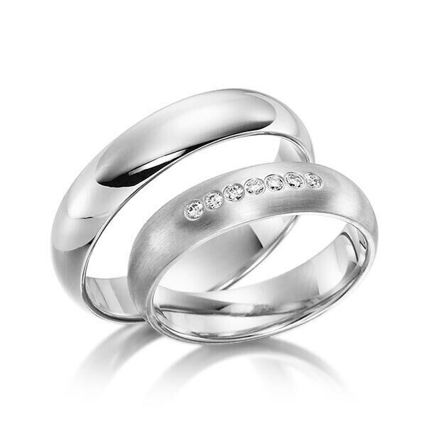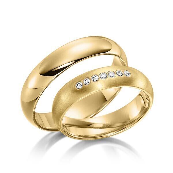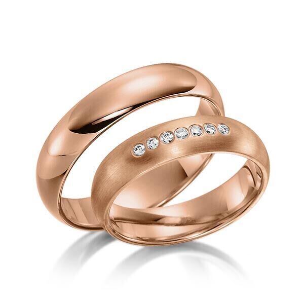Deze ringen, model TR0541 komen uit de collectie Sickinger van de Duitse firma Eduard G. Fidel. In het rosé uitgevoerd met een ring breedte van 5 millimeter, waarvan de ene in het mat en de andere glanzend is bewerkt. De damesring is uitgevoerd met 7 briljant geslepen diamanten met een totaal gewicht van 0,105 ct. Maar de getoonde trouwringen zijn voorbeelden.