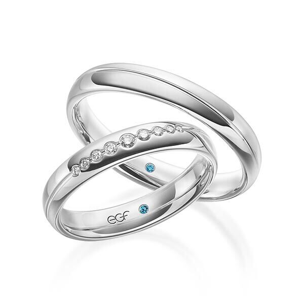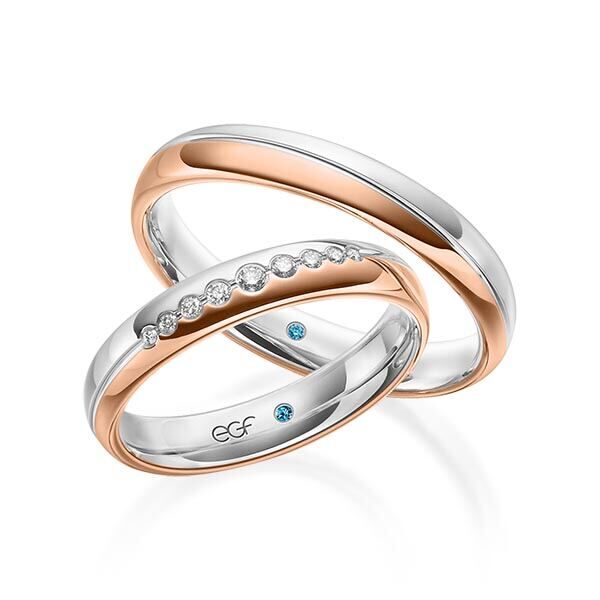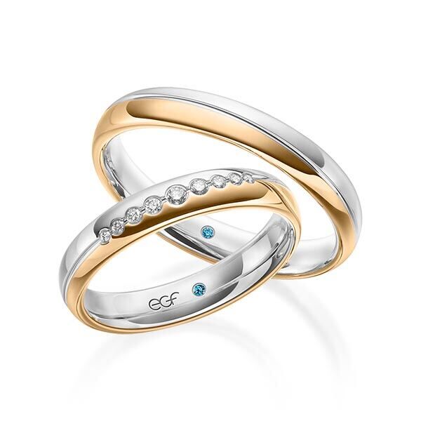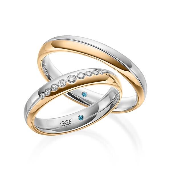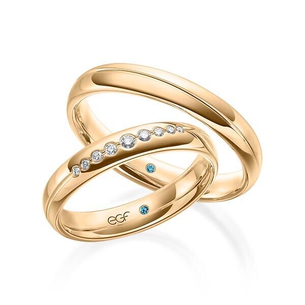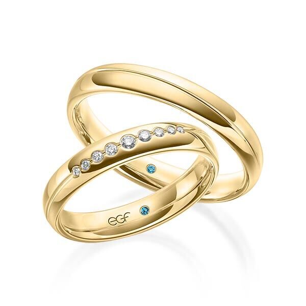 Deze ringen, model TR0634 komen uit de EGF collectie van het Duitse kwaliteitsmerk E.G.F. (Eduard G. Fidel). Ze zijn vervaardigd in het geel en wit en ze zijn 4 millimeter breed, glanzend  bewerkt. De damesring is voorzien van in totaal 0,101 ct. aan briljant geslepen diamant. Maar de getoonde trouwringen zijn voorbeelden.