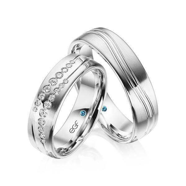Deze ringen, model TR0641 van het merk Eduard G. Fidel zijn in het geel uitgevoerd met een breedte van 6 millimeter. Ze zijn in mat met een glanzende middenbaan bewerkt. De damesring is uitgevoerd met 19 diamanten met een totaal diamant gewicht van 0,197 ct. Deze zijn ingewreven gezet op de golflopende voegen.