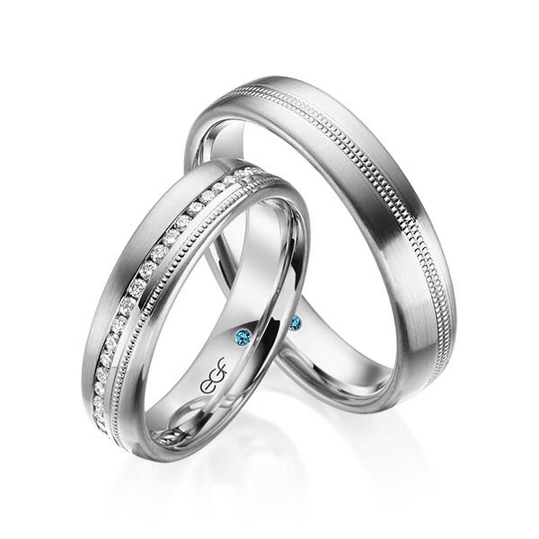 Deze ringen, model TR0645 komen uit de collectie van de Duitse firma Eduard G. Fidel. In het rosé uitgevoerd met een ring breedte van 5 millimeter en ze zijn zowel mat als glanzend bewerkt. De damesring is uitgevoerd met totaal 0,47 ct. aan briljant geslepen diamant. Deze zijn diagonaal golvend rondom over de ring geplaatst in een kanaalzetting.