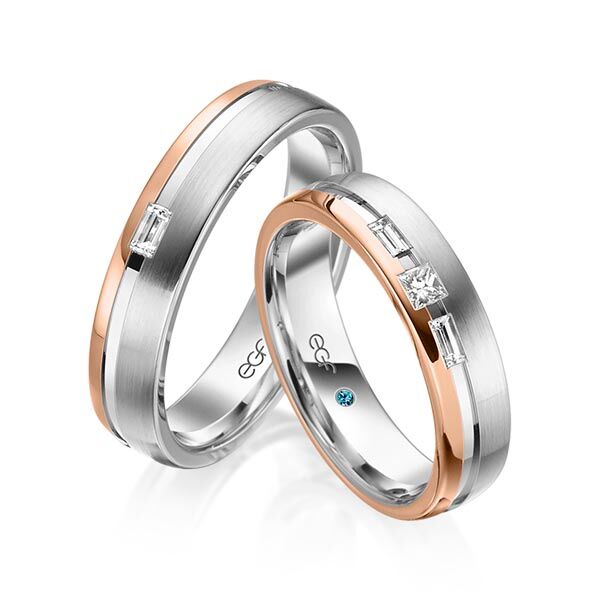 De getoonde ringen model TR0649 worden geproduceerd door het Duits kwaliteitsmerk Eduard G. Fidel (E.G.F.). Deze specifieke uitvoering is gemaakt in een combinatie van wit en rood. Ze zijn aan de buitenzijde mat en glans bewerkt en 5 mm. breed. De damesring is bezet met totaal 0,18 ct. aan diamant. Maar dit is een voorbeeld.