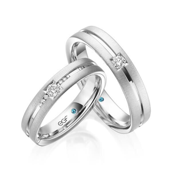 Deze ringen, model TR0662 zijn in het wit uitgevoerd van het merk Eduard G. Fidel. De ring breedte is 4,5 millimeter en ze zijn mat bewerkt met een glanzende groef. Beiden ringen zijn met een 0,10 ct. briljant geslepen diamant uitgevoerd. Deze is geplaatst in een vierkante ingewreven zetting. Waarbij de ene ring zes extra briljanten zijn 0,005 ct. per stuk zijn geplaatst.