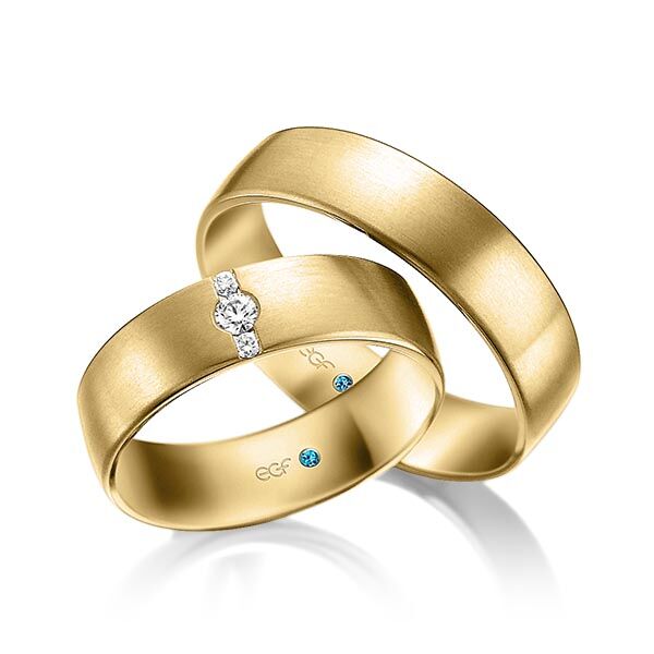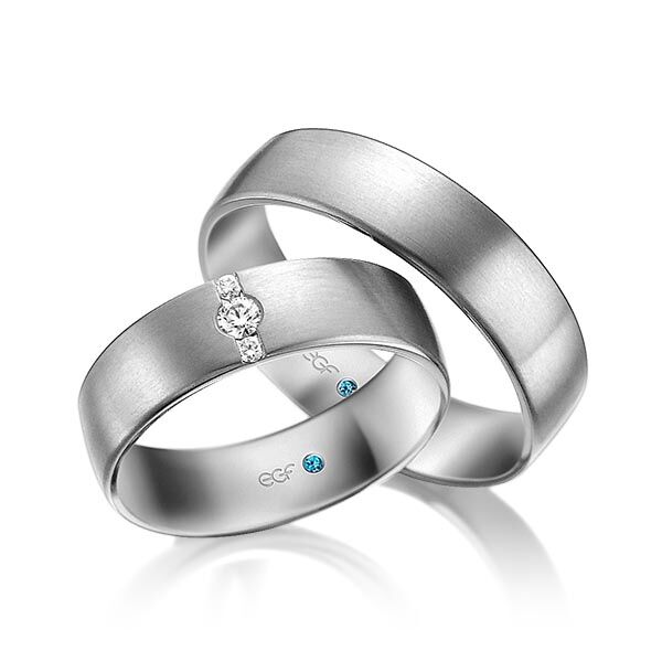 Deze ringen, model TR0672 zijn in het wit uitgevoerd van het merk Eduard G. Fidel. De ring breedte is 6 millimeter en deze zijn fijn mat bewerkt. De damesring is voorzien van 3 briljant geslepen diamanten met een totaal gewicht van 0,10 ct. Deze zijn over de breedte van de ring gezet. Maar de getoonde trouwringen zijn voorbeelden.