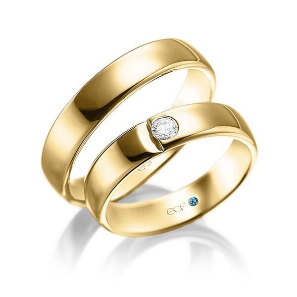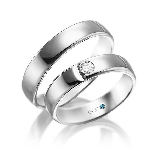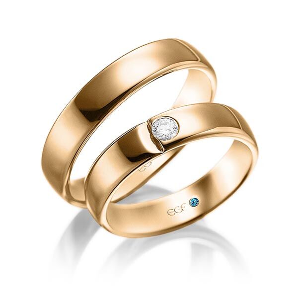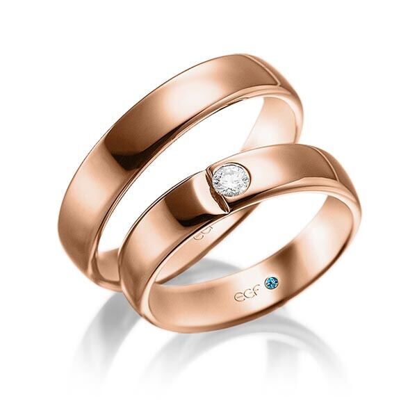 Deze ringen, model TR0680 komen uit de collectie van de Duitse firma Eduard G. Fidel. In het rosé uitgevoerd met een ring breedte van 5 millimeter en ze zijn glanzend mat bewerkt. De damesring is uitgevoerd met een 0,12 ct. briljant geslepen diamant die is geplaatst in een half open ingewreven zetting. Maar de getoonde trouwringen zijn voorbeelden.