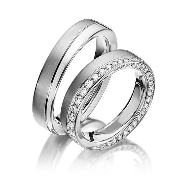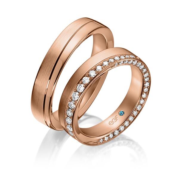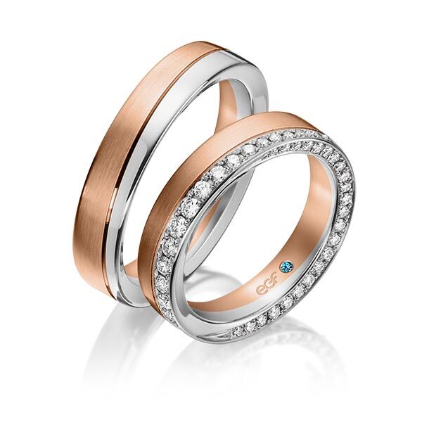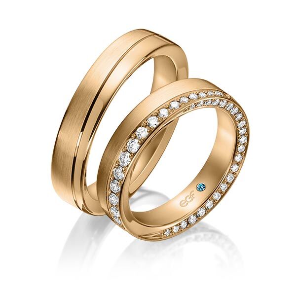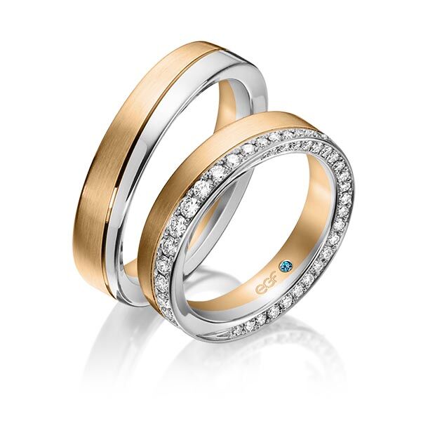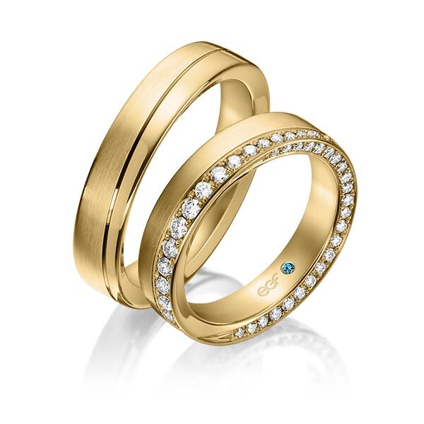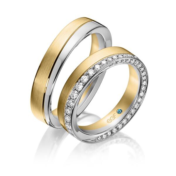 Deze ringen, model TR0681 komen uit de EGF collectie van het Duitse kwaliteitsmerk E.G.F. (Eduard G. Fidel). Ze zijn vervaardigd in het geel en wit en ze zijn 5 millimeter breed, glans en fijn mat bewerkt. De damesring is voorzien van in totaal 0,66 ct. aan briljant geslepen diamant. Maar de getoonde trouwringen zijn voorbeelden.