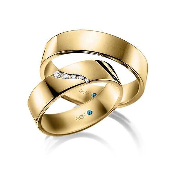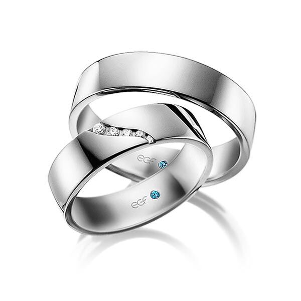 Deze ringen, model TR0682 zijn in het wit uitgevoerd van het merk Eduard G. Fidel. De ring breedte is 5,5 millimeter en ze zijn glanzend gepolijst bewerkt. De damesring is voorzien van 5 briljant geslepen diamanten met een totaal gewicht van 0,058 ct. Deze zijn in een gegolfde kanaalzetting over de breedte van de ring geplaatst.