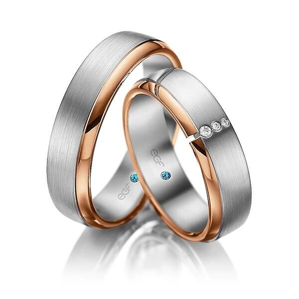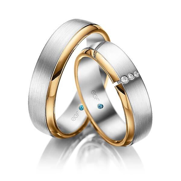 Deze ringen, model TR0708 komen uit de EGF collectie van het Duitse kwaliteitsmerk E.G.F. (Eduard G. Fidel). Ze zijn vervaardigd in het wit met geel en ze zijn 6 millimeter breed met een  bewerking in mat en glanzend. De damesring is voorzien van in totaal 0,035 ct. aan briljant geslepen diamant. Maar de getoonde trouwringen zijn voorbeelden.