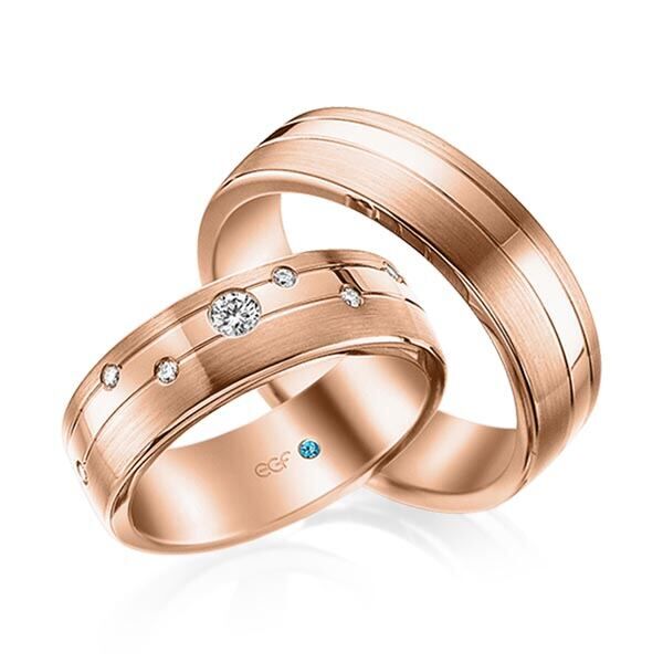 Deze ringen, model TR0709 zijn in het wit uitgevoerd van het merk Eduard G. Fidel. De ring breedte is 6,5 millimeter en ze zijn fijn mat en glanzend bewerkt. De damesring is voorzien van 11 briljant geslepen diamanten met een totaal gewicht van 0,17 ct. Deze zijn gestrooid in ronde ingewreven zettingen geplaatst. Maar de getoonde trouwringen zijn voorbeelden.