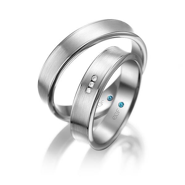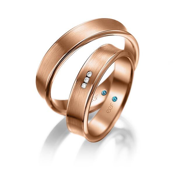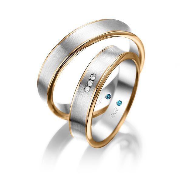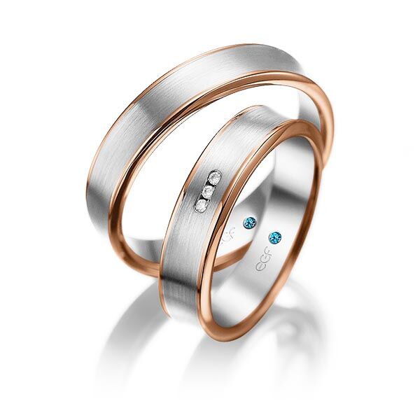 De getoonde ringen model TR0714 worden geproduceerd door het Duits kwaliteitsmerk Eduard G. Fidel (E.G.F.). Deze specifieke uitvoering is gemaakt in een combinatie van wit en rood. Ze zijn aan de buitenzijde mat en glans bewerkt en 5 mm. breed. De damesring is bezet met totaal 0,03 ct. aan briljant geslepen diamant. Maar dit is een voorbeeld.