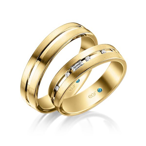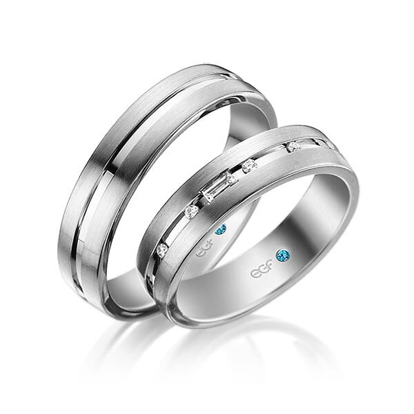 Deze ringen, model TR0722 zijn in het wit uitgevoerd van het merk Eduard G. Fidel. De ring breedte is 5 millimeter en ze zijn in het mat bewerkt met een het glanzende midden groef. De damesring is voorzien van een baguette geslepen diamant van 0,05 ct. en 4 briljant geslepen diamanten van 0,01 ct. Deze zijn verlaagd in de groef van de ring gezet.