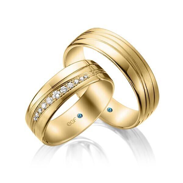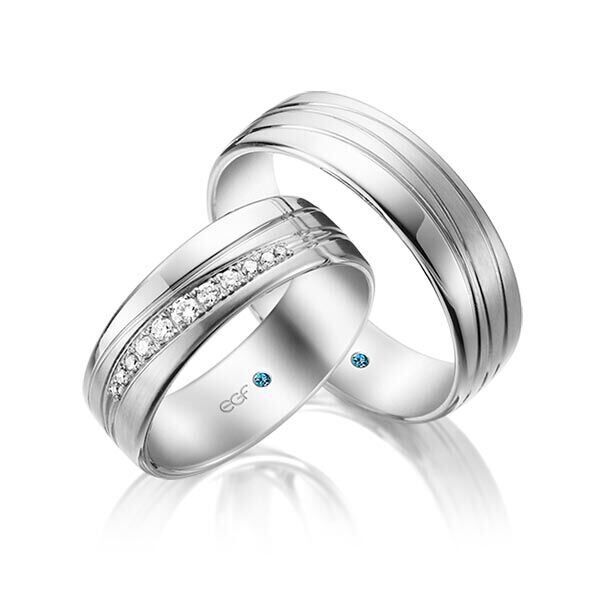 Deze ringen, model TR0724 zijn in het wit uitgevoerd van het merk Eduard G. Fidel. De ring breedte is 6,5 millimeter en ze zijn in glanzend bewerkt en voorzien van sier groeven. De damesring is voorzien van 11 briljant geslepen diamanten met een totaal gewicht van 0,146 ct. Deze zijn oplopend in diameter in een schuine lijn pavé gezet.