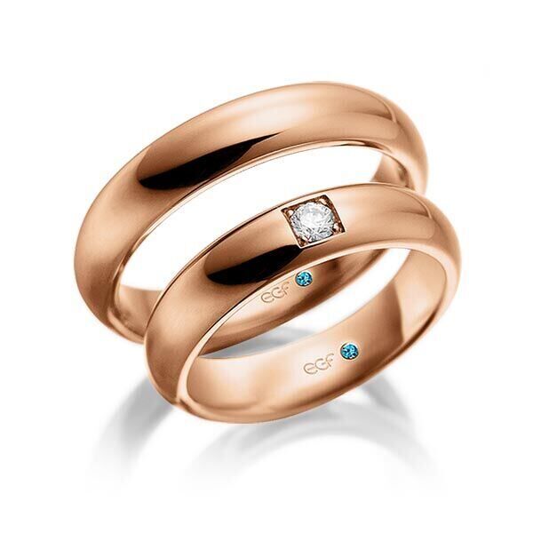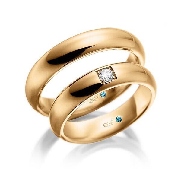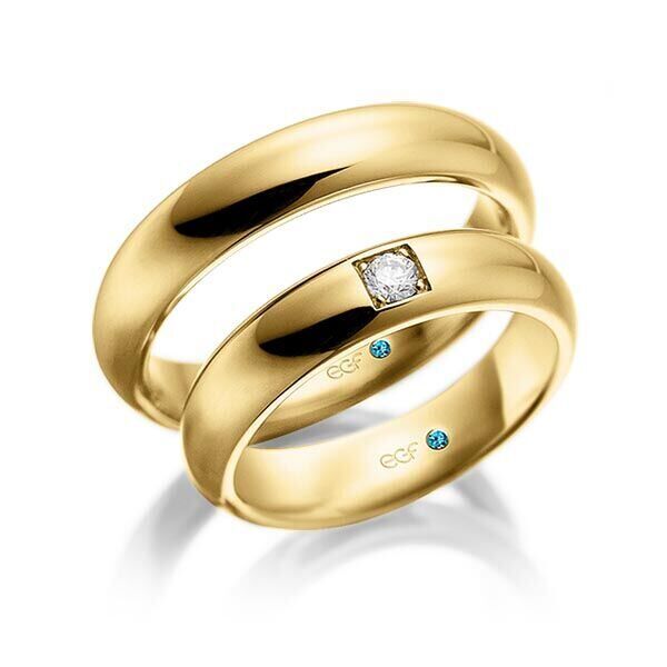 Deze ringen, model TR0738 van het merk Eduard G. Fidel zijn in het geel uitgevoerd met een breedte van 5 millimeter. Ze zijn glad uitgevoerd en glanzend bewerkt. De damesring is uitgevoerd met een 0,10 ct. briljant geslepen diamant. Deze is pavé in een vierkant uitgestoken vorm gezet. Maar de getoonde trouwringen zijn voorbeelden.