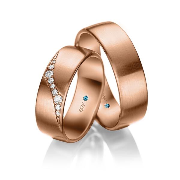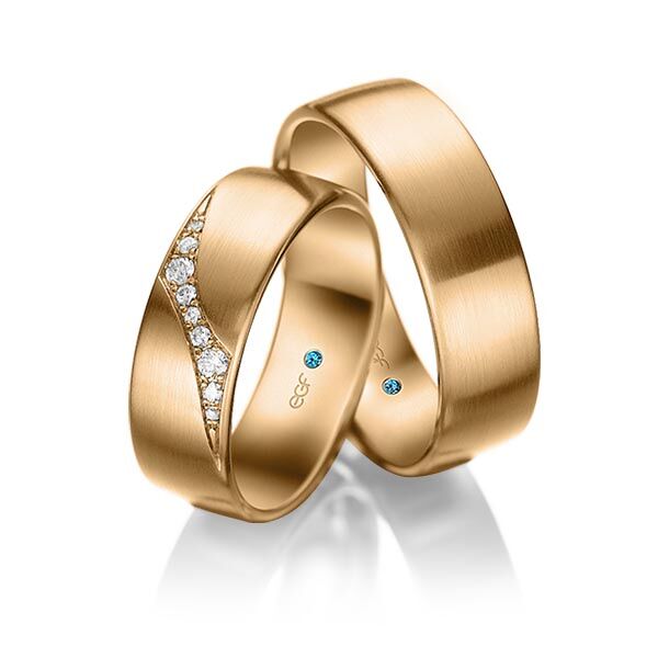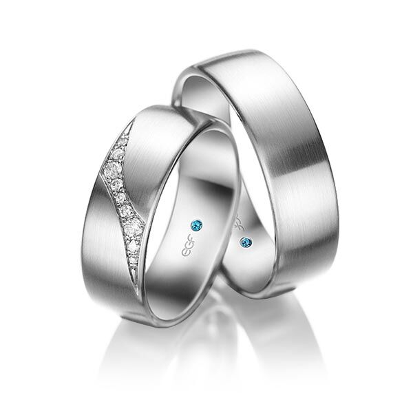 Deze ringen, model TR0742 zijn in het wit uitgevoerd van het merk Eduard G. Fidel. De ring breedte a 7 millimeter is fijn mat bewerkt waarvan de damesring is voorzien van 9 briljant geslepen diamanten met een totaal diamant gewicht van 0,115 ct. Deze zijn in fantasie zetting over de breedte van de ring geplaatst. Maar de getoonde trouwringen zijn voorbeelden.
