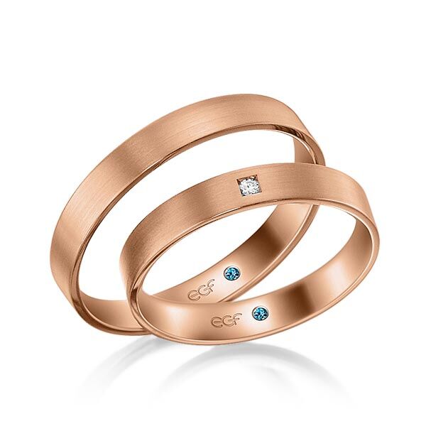 Deze ringen, model TR0759 zijn in het wit uitgevoerd van het merk Eduard G. Fidel. De ring breedte a 3,5 millimeter is in fijn mat bewerkt. De damesring is voorzien van een briljant geslepen diamant van 0,0015 ct. Deze is pavé in een vierkant ingewreven zetting geplaatst. Maar de getoonde trouwringen zijn voorbeelden.