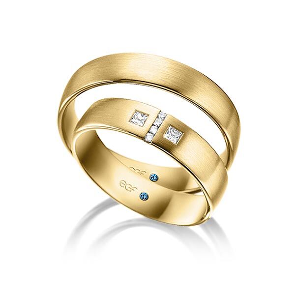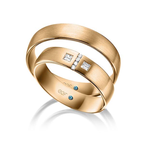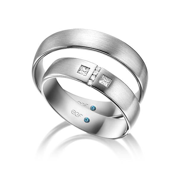 Deze ringen, model TR0767 zijn in het wit uitgevoerd van het merk Eduard G. Fidel. De ring breedte a 5 millimeter is in fijn mat bewerkt. De damesring is voorzien van 6 diamanten met een totaal gewicht van 0,132 ct. Hiervan zijn de twee princess geslepen diamanten centraal geplaatst, waarbij de rest over de breedte van de ring hiertussen zijn gezet.