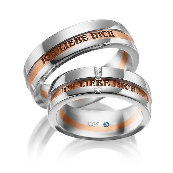 Deze ringen, model TR0781 komen uit de EGF collectie van het Duitse kwaliteitsmerk E.G.F. (Eduard G. Fidel). Ze zijn vervaardigd in het wit met geel en ze zijn 6,5 millimeter breed met een glans matte bewerking, waarvan het gele deel voorzien van tekst wordt. De damesring is voorzien van in totaal 0,03 ct. aan briljant geslepen diamant. Maar de getoonde trouwringen zijn voorbeelden.
