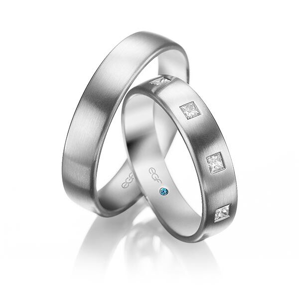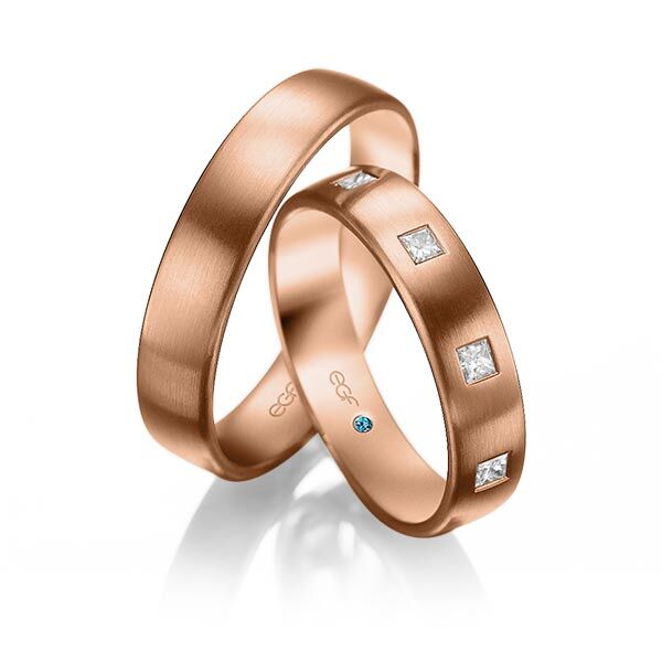 Deze ringen, model TR0787 van het merk Eduard G. Fidel zijn in het geel uitgevoerd met een breedte van 5 millimeter. Ze zijn glad uitgevoerd en fijn mat bewerkt. De damesring is uitgevoerd met 9 princess geslepen diamanten van 0,05 ct. per stuk. Deze zijn in ingewreven zettingen over de ring verdeeld geplaatst. Maar de getoonde trouwringen zijn voorbeelden.