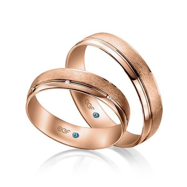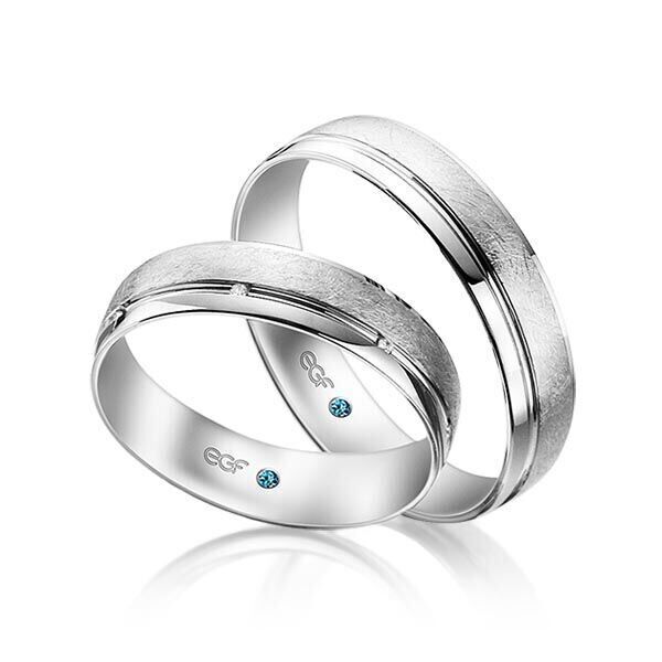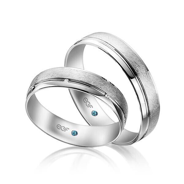 Deze ringen, model TR0801 zijn in het wit uitgevoerd van het merk Eduard G. Fidel. De ring breedte is 5 millimeter en ze zijn in het ijs mat met een glanzende baan bewerkt. De damesring is voorzien van 7  briljant geslepen diamant a 0,005 ct. Deze zijn in een kanaalzetting geplaatst en over de ring verdeeld. Maar de getoonde trouwringen zijn voorbeelden.