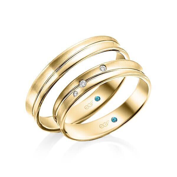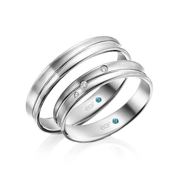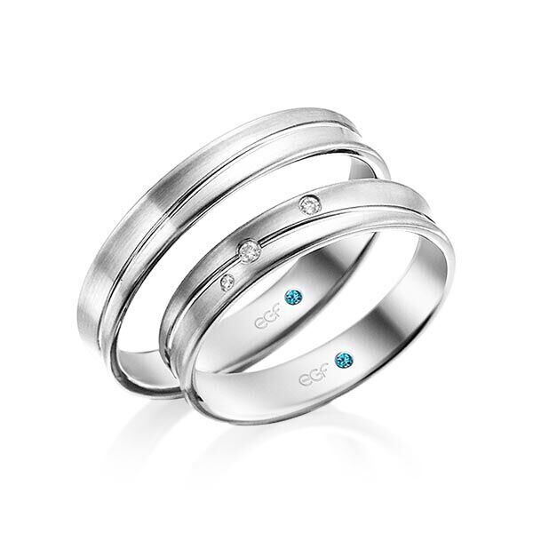 Deze ringen, model TR0809 zijn in het wit uitgevoerd van het merk Eduard G. Fidel. De ring breedte is 4 millimeter en ze zijn in fijn mat met een glanzende diagonale voeg bewerkt. De damesring is voorzien van 0,03 ct. aan briljant geslepen diamant in totaal. Deze zijn in ronde ingewreven zetting geplaatst.