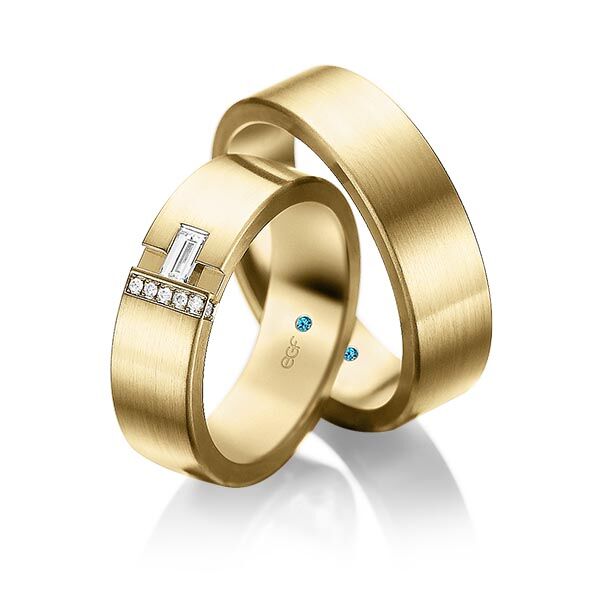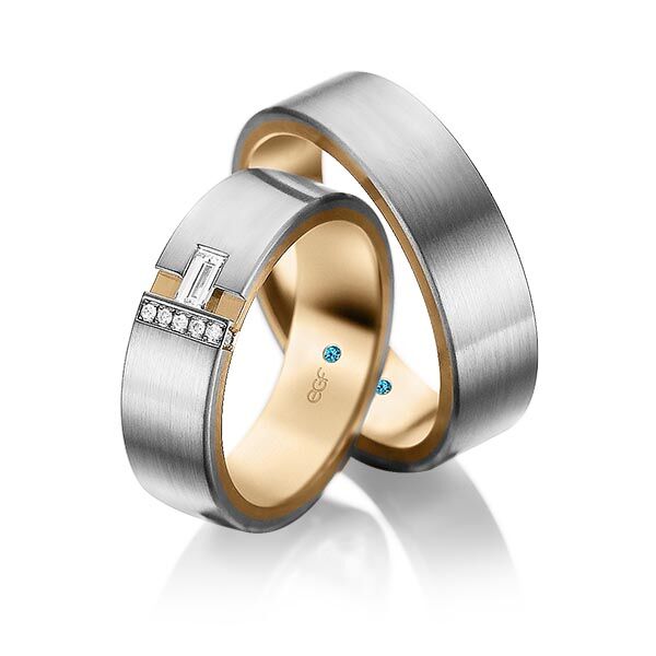 De getoonde ringen model TR0827 worden geproduceerd door het Duits kwaliteitsmerk Eduard G. Fidel (E.G.F.). Deze specifieke uitvoering is gemaakt in een combinatie van wit en rood. Ze zijn mat en glanzend bewerkt en 6,5 mm. breed. De damesring is bezet met 0,155 ct. totaal aan diamant. Maar dit is een voorbeeld.