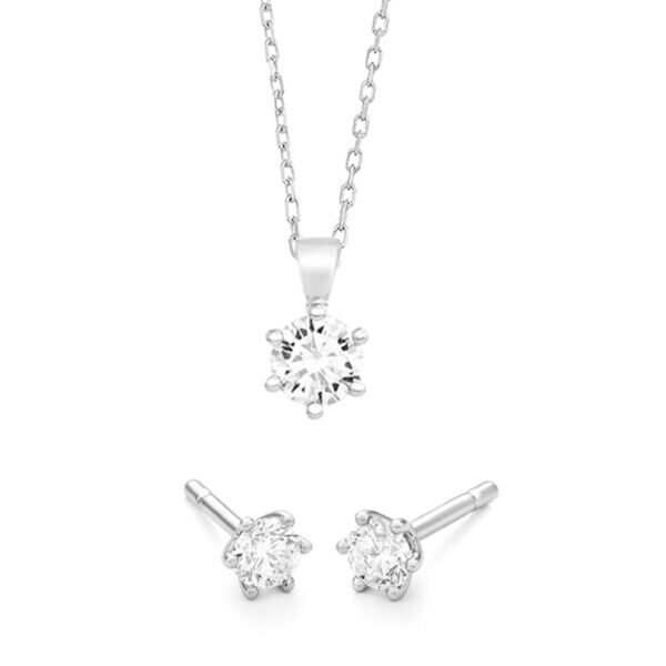 Deze 18 karaat witgouden WGS0020E18 model Princess set is leuk om te geven, maar fantastisch om te ontvangen. De set bestaat uit een gouden ketting met solitaire diamanten hanger met bijpassende oorknoppen. Waarin in iedere zes poot zetting een 0,40 caraat briljant geslepen diamant is gezet.