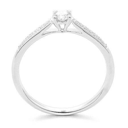Deze veertien briljanten van 0,005 caraat per stuk hebben een gezamenlijk gewicht van 0,07 ct. Waarvan je aan weerskanten van de centrale briljant er zeven vindt. En hiermee komt het totale diamant gewicht van deze ring op 0,27 caraat.