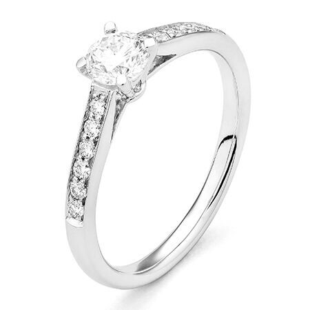 Deze twaalf briljanten van 0,014 caraat per stuk hebben een gezamenlijk gewicht van 0,17 ct. Waarvan je aan weerskanten van de centrale briljant er zeven vindt. En hiermee komt het totale diamant gewicht van deze ring op 0,60 caraat.