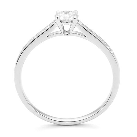 Deze twaalf briljanten van 0,014 caraat per stuk hebben een gezamenlijk gewicht van 0,17 ct. Waarvan je aan weerskanten van de centrale briljant er zeven vindt. En hiermee komt het totale diamant gewicht van deze ring op 0,70 caraat.