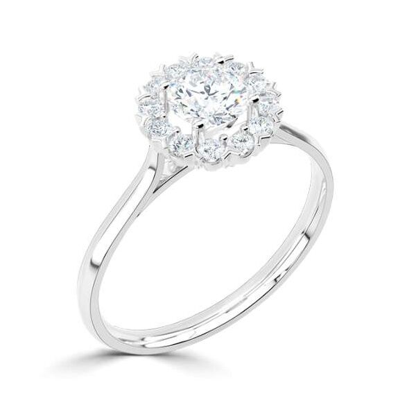 Deze prachtige diamanten Halo ring wordt ook vaak als verlovingsring of trouwring gedragen. Vervaardigd in 14 karaat witgoud en uitgevoerd met in het midden een briljant geslepen diamant van 0,50 ct. Daarom heen in de entourage rand zijn 12 briljant geslepen diamanten in witgoud gezet met een totaal gewicht van 0,24 ct. En dit zorgt voor een authentieke rijkelijke en tijdloze uitstraling.